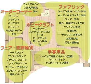 「布のある生活」をテーマに、ソーイング・パッチワーク・キルト・ビーズ・ホビークラフト用品などを豊富に取り揃えて、手作りの暖かさと布を使ったインテリアを提案するお店です。