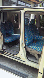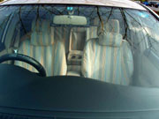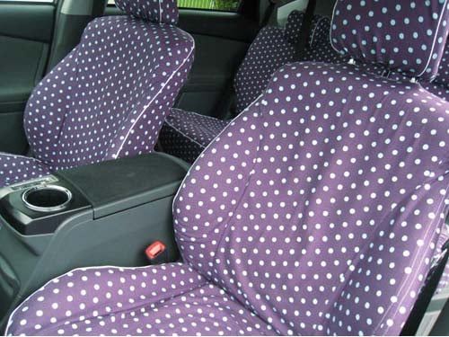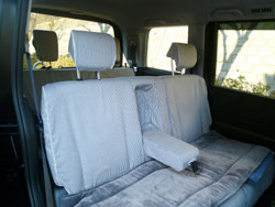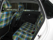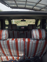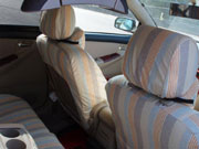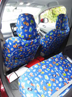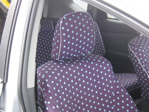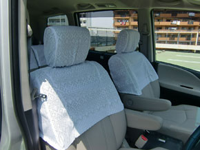 全体的に手の込んだ作りで、とくに前席のヘッドレスト用カバー2枚は、各々マジックテープ5対・10枚および複雑な布パーツの組合せで、ヘッドレストの支柱2本までもすっぽり包み込んで前シートの背もたれのカバーと一体化したように見せる構造の力作で、感心しました。